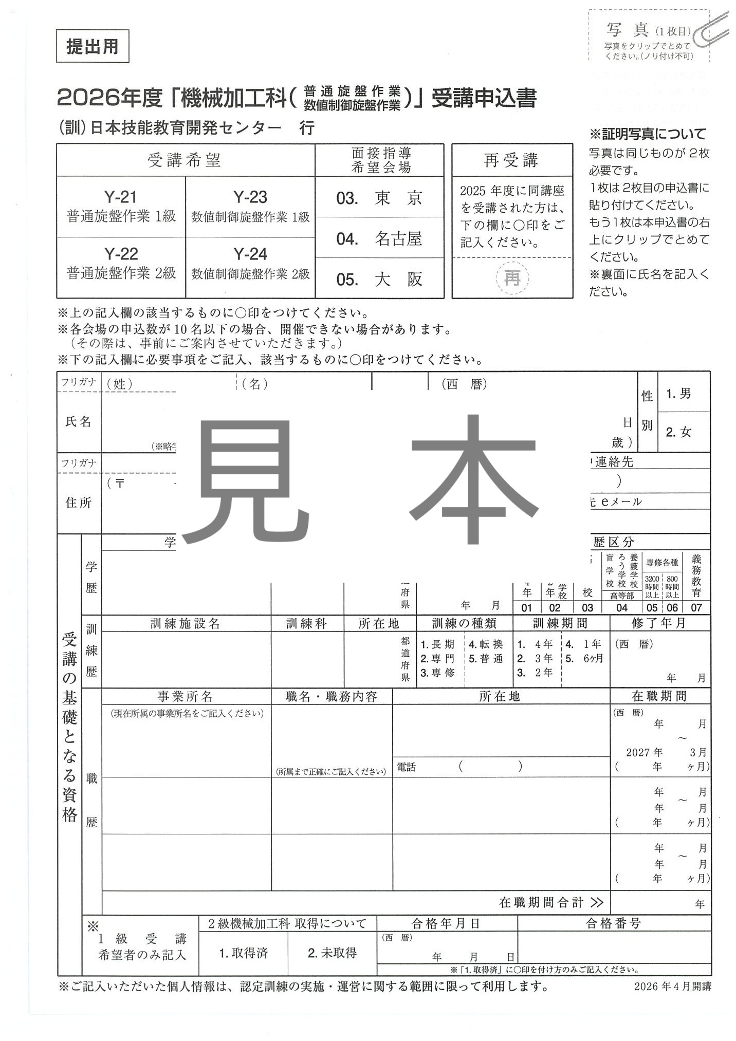お知らせ 2026年度:1・2級技能士コース・機械加工科【4月開講のみ】募集開始しました! 認定職業訓練(技能検定学科試験免除コース)。修了により国家技能検定の学科試験が免除!! ★ 申込書締切:2026年3月6日必着です。 ※2026年2月中旬までに「受講申込書」の送付依頼をお願いいたします。 詳細はこちらへ 2025年11月18日 お知らせ