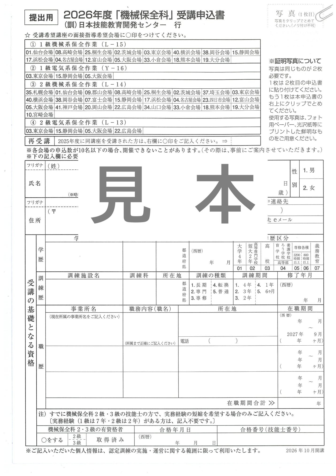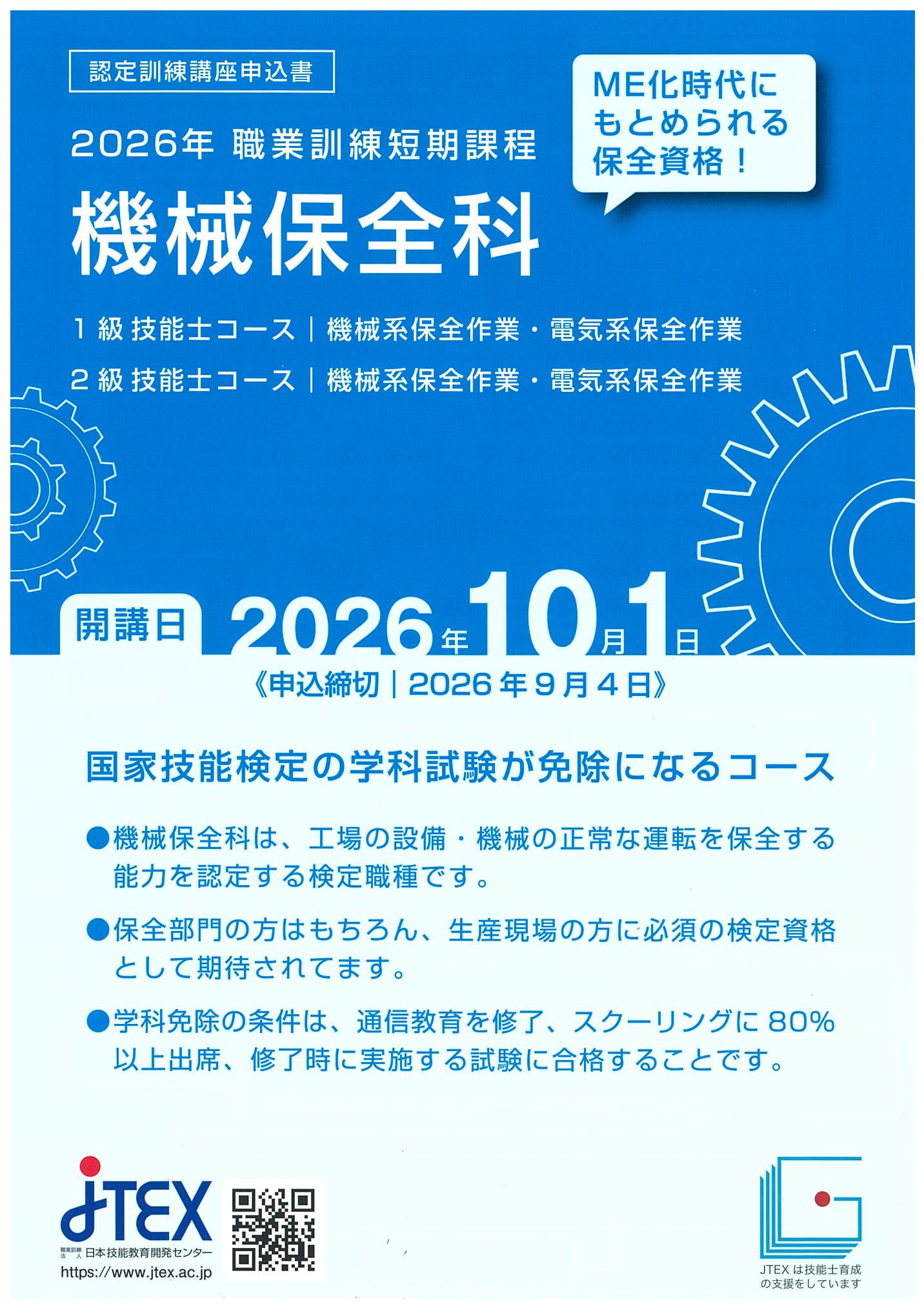 お知らせ 2026年度:1・2級技能士コース・機械保全科【10月開講】募集開始しました! 認定職業訓練(技能検定学科試験免除コース)。修了により国家技能検定の学科試験が免除!! ★ 申込書締切:2026年9月4日JTEXに必着です。 詳細はこちらへ 2026年3月16日 お知らせ